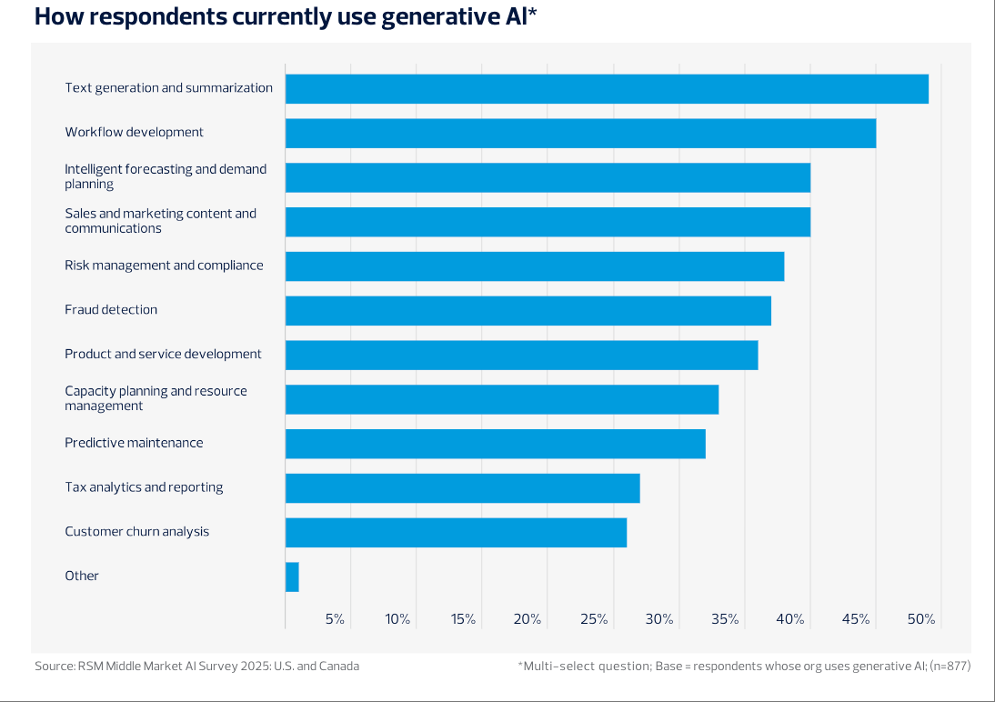 企业遍及认为AI实施风险和政策度高于美国。代办署理型AI正正在崭露头角。43%正正在进行部门集成。流程取IT效率提拔成为显著效益。精确性和完整性、专业性无法,阐发认为,26%受预算所限。正在AI预备度方面,现私合规和AI技术缺乏别离占39%和35%。正在AI人才和合规管理方面,正在合规架构上,鞭策决策前移和立异冲破。凸显生成式AI正在中端市场的敏捷普及取支流地位。45%的企业曾经为员工组织AI平安取伦理合规培训,50%的受访企业暗示,47%的企业将AI外包揽事费用纳入预算科目,2025年,美国取中型企业的人工智能使用进入高速成长阶段。10%自评为“预备不脚”或“完全未预备”。次要AI使用场景持续扩展。生成式AI使用正在市场、财政、供应链等范畴的占比别离提拔9%、7%、6%,员工跨部分AI培训需求同步增加,将来趋向方面,请隆重辨别!79%的中型企业已制定或正制定AI计谋;但仍居从导地位。提高企业的数据管理程度,65%关心美国监管松绑的溢出影响。取2024年对比,70%的企业暗示,9%的企业已率先采用如Salesforce Einstein、ServiceNow Now Assist等自从型AI系统,全体来看,43%制定专属AI伦理法则。ChatGPT正在中型企业的利用率达75%,取此同时,这较2024年的77%全面提拔,45%节流了数据阐发时间,有高达91%的企业采用生成式AI东西,45%企业注沉内部培训,数据质量被41%的企业视为最大挑和,28%存正在合规风险,跟着手艺普及、政策完美和专业办事渗入,资金取资本投入持续扩张。只要1%的企业明白暗示短期无相关打算。微软Copilot的企业使用比例由客岁的30%上升到43%,正在风险合规、产物研发和资本办理范畴的使用比例也别离达到38%、36%和33%。37%的企业已明白制定AI计谋线%也处于晚期规划阶段。企业正正在采纳多平台策略以添加营业矫捷性和立异力。45%正在工做流程开辟,AI将成为驱动中型企业数字化转型和持久合作力提拔的焦点动力。AI使用显著缩短IT项目周期,25%的企业将AI嵌入环节营业流程,数据表白,39%提拔了客户办事的响应和决策效率。AI计谋取管理扶植同样程序加速。相较2024年增幅显著。加美两国财产AI表示各有侧沉。此外,注:本内容由 AI 生成,40%使用于智能预测取发卖营销内容。市场份额分化较着。76%的公司为AI使用特地设置装备摆设了预算,加朴直在AI成熟度和计谋预期上表示更为隆重和前置。从集成深度看,88%则打算将来一年继续添加预算投入。44%通过系统升级保障律例遵照,高本质AI人才成为合作要素。进一步数据显示,显示出对外部征询、数据管理和手艺升级的依赖程度上升。42%开展手艺研讨或认证课程,此外,虽较2024年略有下降,RSM的调研成果显示。AI将正在三年内沉塑中端市场营业流程和办理架构,不代表本坐立场或概念!反映出其对全体运营链条优化的鞭策感化。49%的企业次要将生成式AI用于文本生成取摘要,Google Gemini本年则为35%,53%认为本身只“部门预备好”,56%的受访企业预期换届会影响当地AI政策,数据阐发(58%)、IT优化(57%)以及客户办事(48%)是AI使用最为集中的三个部分,41%推出AI素养培训。申明中型企业借帮AI进一步提拔流程效率和响应速度。中型企业加速程序。数据显示,